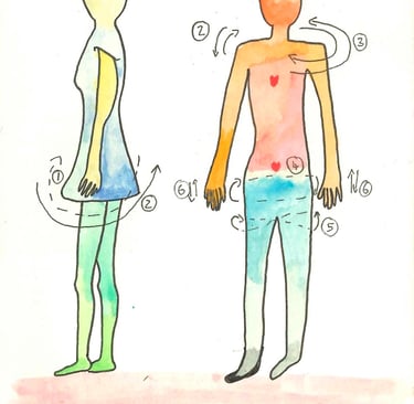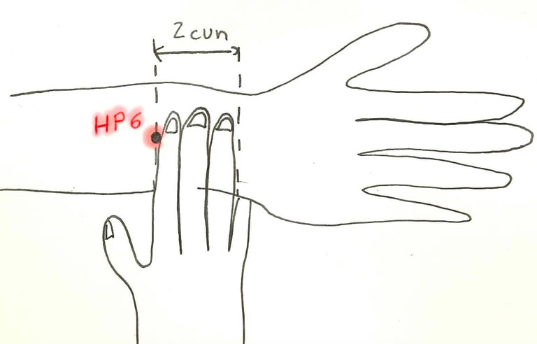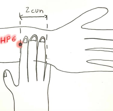 Finally, if you have nausea or sickness, you can try the wonderful point, Heart Protector 6 (HP6). Its name means the “Inner door”, a passage to the inside world. It is located (see my terrible drawing) on the middle of your inner arm, at a 3 fingers distance from your wrist. With your body and arms relaxed, press the point with a relaxed thumb. Begin gently. You can try different angles, and press more firmly, as you feel. Pressure can be short or long. Just feel the effect, closing your eyes. You can do both sides and feel the difference between them.