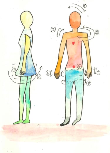 Third exercise is there to move slightly and bring awareness to your posture. First bend your knees, find the balance of your pelvis. Rock is from front to back a few times. Feel the effect of the rocking on the rest of your posture, from feet to head. Find a point there, where you are comfortable, where the pelvis is slightly tucked down, and your body can float up from the grounding of your feet. When you feel comfortable, move the different parts of your body (1) head, (2) shoulders, (3) upper back, then move your pelvis (4) in a circle, (5) in a 8-shape, and (6) each hip up and down. In between each of these exercises you can take time in the neutral, comfortable position, to feel the centre, and the connection to earth and sky.